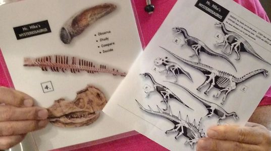 Mr. Mike displays a "discovery" paper and each child receives a "dino skeleton" paper. Together, they review and discuss what bones were discovered. They try to recognize them in a full dinosaur skeleton...and finally they try to name the animal.